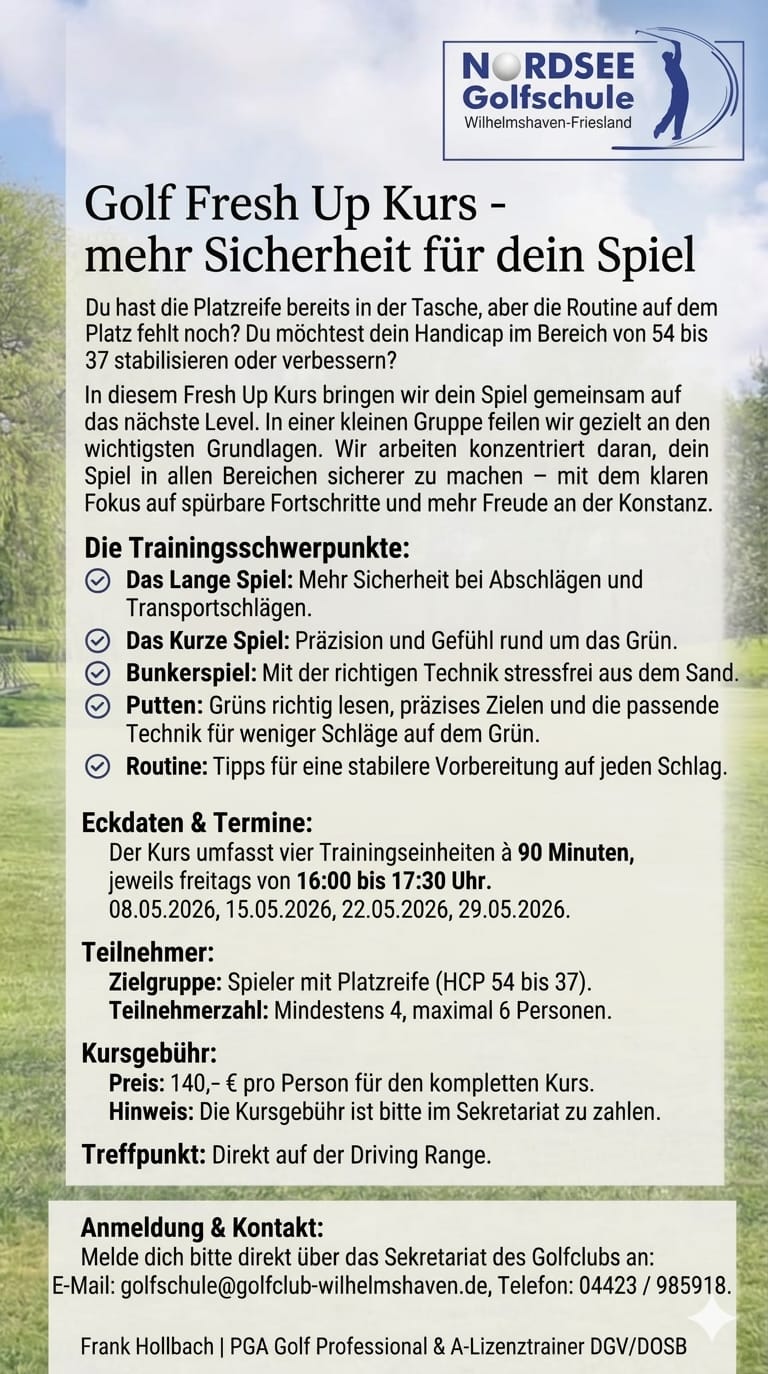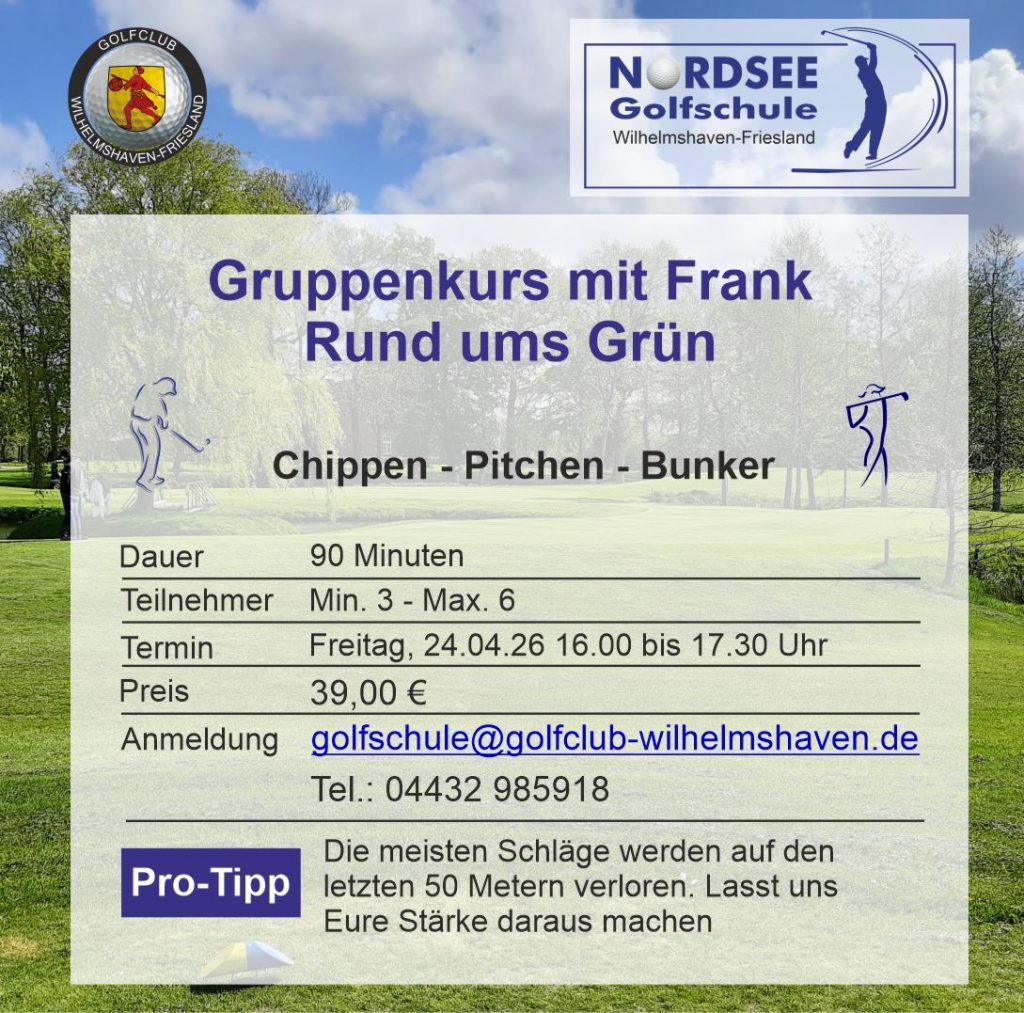 Unser Gruppenkurs Chippen – Pitchen – Bunker bereitet Dich optimal auf das kurze Spiel vor. Lerne die unterschiedlichen Techniken für hohe und flache Chips oder den sicheren Schlag aus dem Bunker.